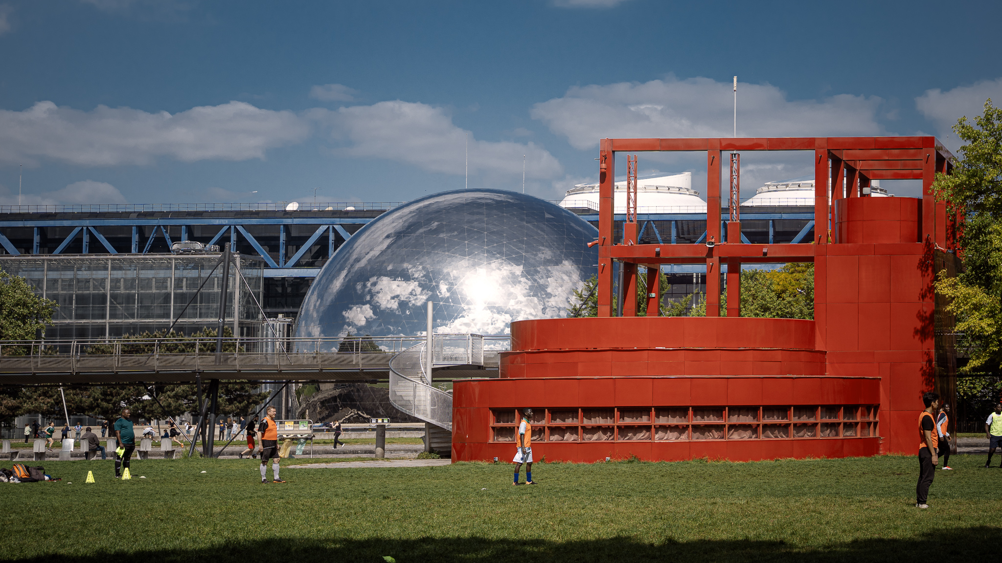 The park follows a deconstructivist master plan by Bernard Tschumi, realized in stages during the 1980s and 1990s. Striking are the 26 small red follies distributed across the site in a deliberate pattern.